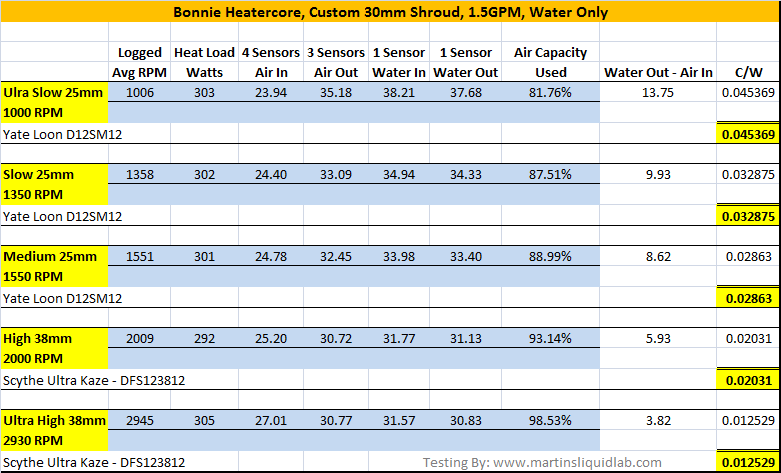 Also worthy of noting, like any radiator, there is a significant performance increase between the ultra slow and ultra high fans, in this case you get about 3.6X the performance using 3000RPM 38mm fans vs 1000RPM 25mm fans.