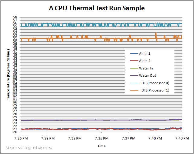- Logging Water and Core-Temps - Core-temps reading from TAT (Thermal Analysis Tool) or any other only have a resolution down to 1 degree and it's very common to see core temperatures fluctuate over several degrees. The only way to accurately get a measurement beyond the one degree posted resolution is to log those results over a long period of time. I've chosen to log temperatures over a 30 minute increment after warm up.