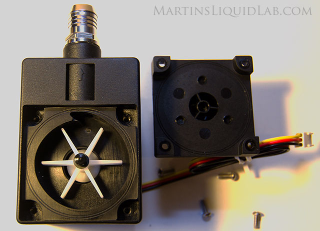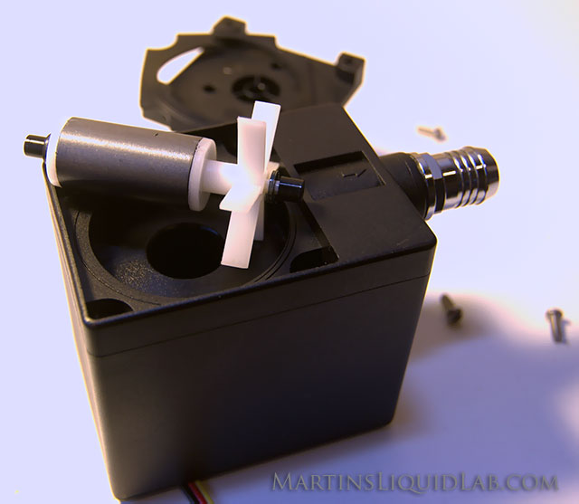 Upon opening the pump, I was pleasantly surprised to see the volute is a true spiral shape, that's the most efficient shape for centrifugal pumps, and this should translate to high efficiency and lower heat dump. Also if you take a close look at the photo below, you'll see the impeller shaft is actually ceramic and not steel, this will also ensure a long high efficiency life of the mating surface between the impeller blades and the shaft. The Alphacool AP1510 pump I reviewed used a stainless steel shaft, and the DDC, D5, and Iwaki RD-30 all use higher quality ceramic for their bearings or shafts. Also rather than an o-ring, the CPX-Pro uses a rubber gasket that covers the pump top surface which you can see in the photo above and in the background below.
