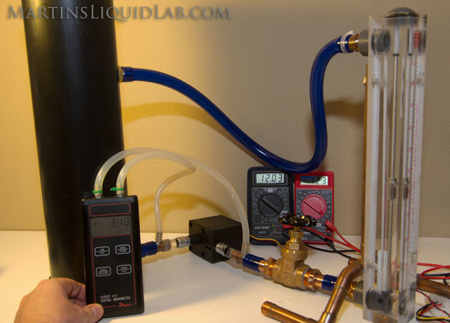 The most scientific way to determine a pumps performance is to plot the entire pump pressure vs flow rate curve. This can be done by measuring pressure at the inlet and the outlet of the pump with a digital manometer and using a gate valve immediately after this pressure measurement point. This method of capturing both the inlet and outlet pressure then gives you the "Totat Dynamic Head" in pressure in (PSI) . This method is consistent with the recommendations by gouldspumps.com pump field testing technical article for field testing and I believe more accurately captures the entire power provided by a pump and will provide more accurate curves for estimating flow rates. Then utilizing this gate valve, adjusting the amount of restriction will net different flow rates and coinciding pressures the pump is producing over its curve. All of this is preferably done at a very precise 12.00V or the tested voltage as needed. While testing for pressure and flow rates, data was also collected using multi-meters to capture voltage and current in amps for power consumption data.