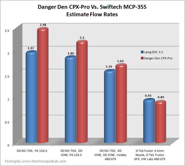 I'm really impressed with this pump for several reasons. The smaller sibling (CPX-1) has a strong reputation for being one of the quietest pumps around, and it's nice to see this larger and more powerfull big brother pump follow suit. It's very similar in pumping power to that of the Laing DDC 3.2, but it does so with less power consumption/heat dump and it also already comes with G1/4 barbs. The DDCs and D5 are also excellent pumps, and now we have another one to choose from with similar excellent performance. This is an excellent all around pump for most water cooling systems. Danger Den tells me this pump will retail for around $54.95, so it's at an extremely competetive price point and would cost less than both the Laing D5 and the Laing DDC 3.2. Good news for us!!