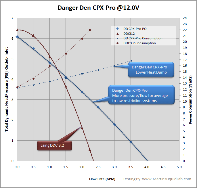 The pump performs very well compared to the stock DDC 3.2. An average to low restriction system would typically see higher flow rates with the CPX-Pro, and really high restriction systems would see very slightly more performance from the DDC. The important part that catches my attention is the power consumption. At the 2 GPM mark, the DDC is consuming nearly 21 watts, where then DD CPX-Pro is only consuming about 15 watts, so the DDC at that point is consuming about 40% more power which in the end becomes added heat to the loop.