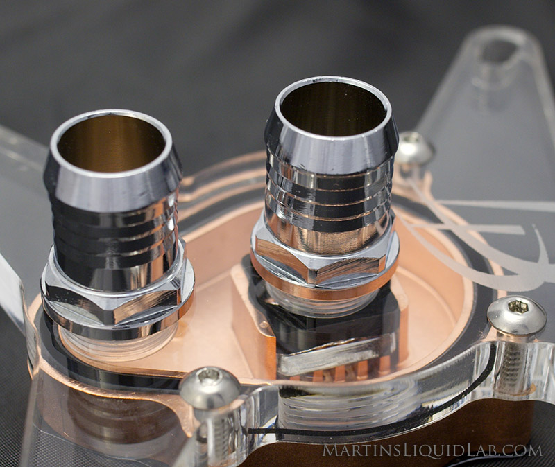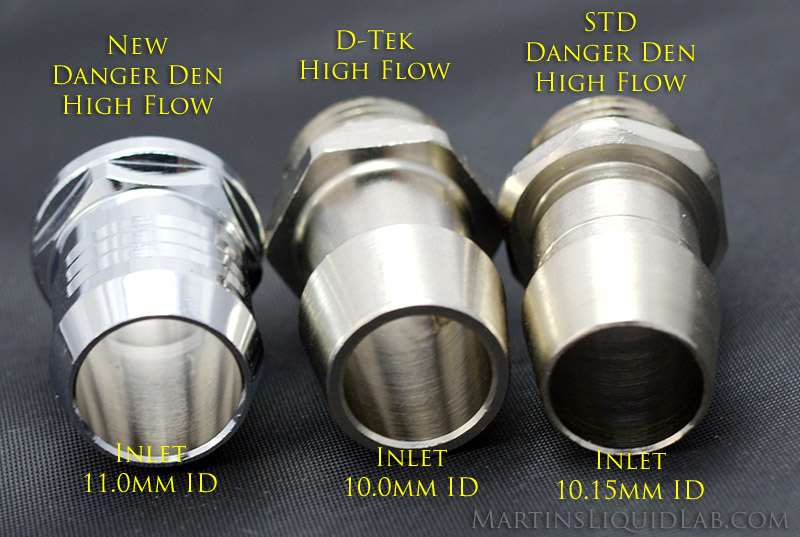 - Substantial Oversized Inlet - A standard High Flow G1/4 fitting is typially about 9.9 to 10.1 mm inside diameter which is about the maximum you can remove and still have adequate brass strength for the G1/4 threading. Danger Den has taken an additional 1 millimeter (Total 11.0mm) at the inlet side and provided a very gradual transition before reaching the threads. This will minimize the step down entrance loss from the inside diameter of tubing to the barb.