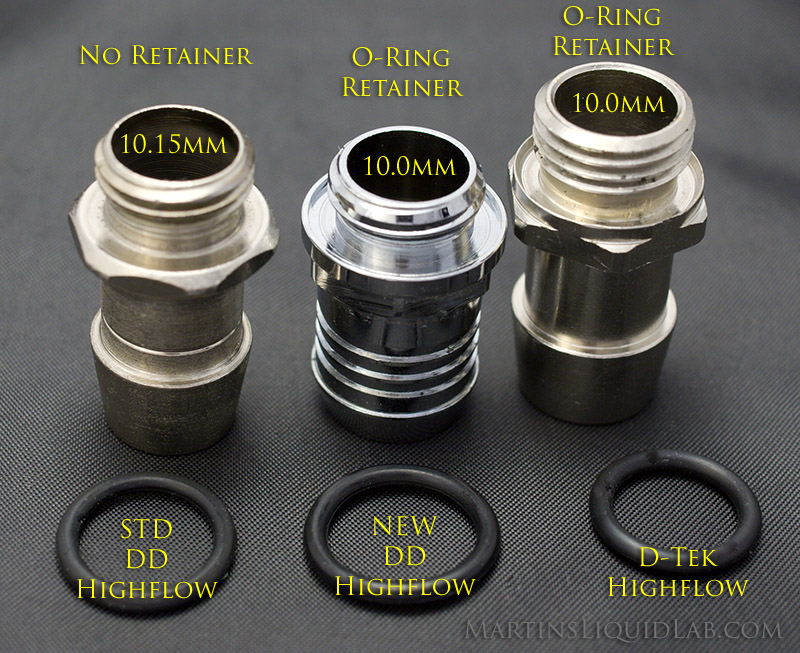 - O-ring retainer - This retainer prevents the o-ring from displacing which can cause a leak in standard barbs when over-tightened, this allows you to install these with a fair amount of force and now worries about a leaking o-ring. D-Tek barbs also incorporate this very desireable feature.