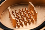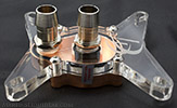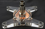 The base is very finely cast from C110 copper and having seen some casting problems in past on other blocks, I was pleasantly suprise that I could not find any. The TDX utilizes a combination of chanels and drill hole dimples to create an array of serpentine channels so water will encounter changes in shape and cross section as it flows through these channels. The serpentine shape will mean more water will change directions and mix and impact the walls. To the right you can see a macro view of thes channel construction and note the nozzle holder wall on each side specifically designed to accomodate nozzles. The base bottom is very adequate in finish, you can see by the photo above in the gallery how it is a nicely finished base nearly a mirror in reflection and a straightedge test proved flatness to be excellent. It's fairly common knowledge that lapping a base much beyond 1000 grit no longer yields additional performance gains, so the specified 1200 grit is more than adequate.