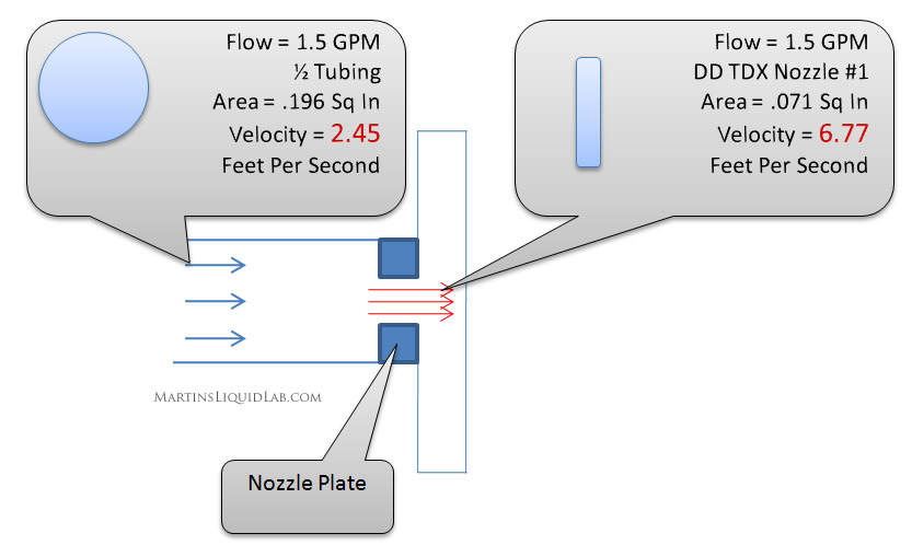 Let me try to explain what occurs in a water block nozzle. A nozzle provides a reduced cross sectional area and increases velocities. Because water and most fluids are considered incompressible, you have the same flow rate in all parts of the system in a close circuit like we have in water cooling. Because flow rate is a constant, when the cross sectional area is reduced, the fluid must travel at a higher velocity. Assuming your system flow rate is 1.5 gallons per minute the Danger Den TDX nozzle would increase velocity in the fluid something similar to this: