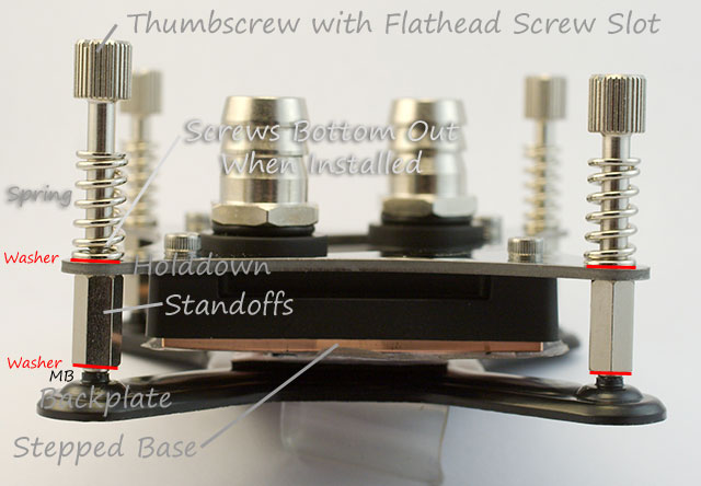 And the OCZ Hydroflow mounting system is very very good. While other blocks require the sticky back to hold the back plate on, OCZ is utilizing standoffs that are similar to motherboard standoffs to work as a means to hold the back plate very securely in place while you mount the block. This ensures you won't have problems with the back plate coming loose when removing the block for servicing and may prevent the need to remove the motherboard in those needs. In addition the thumbscrews are similar to the Apogee GTZ in that you can use the screw heads with your fingers to tighten the screws or switch over to a screwdriver as needed. More importantly the screws are intended to be installed all the way down until they stop, this ensures that all four corners get the appropriate and consistent amount of mounting pressure.