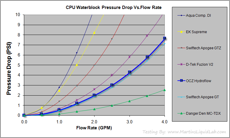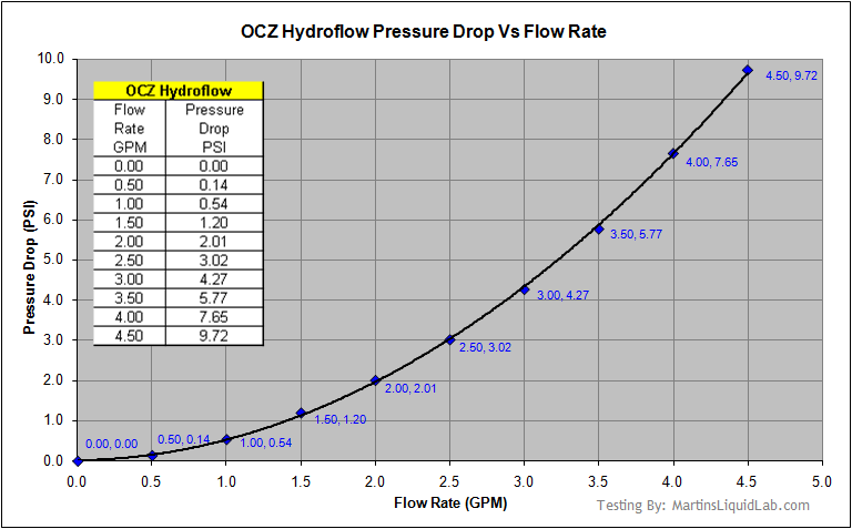 Along with any water block design comes some amount of restriction, but there is a significant difference in the amount of restriction between blocks. This is something to consider and be aware of when selecting your pump and other components as it will impact your loops flow rate. The most scientific and repeatable means to measure and quantify resistance is by measuring the pressure drop across the block inlet and outlet vs. flow rate. You can then use this information to estimate flow rates of a system and further more it's not specific to any one system setup, so it's usable scientific data. It's not the easiest to understand, but I'll explain more in a bit. First up is my tested results using a King Instruments flow rate meter, and Dywer digital manometer, and household tap water to adjust flow rate.