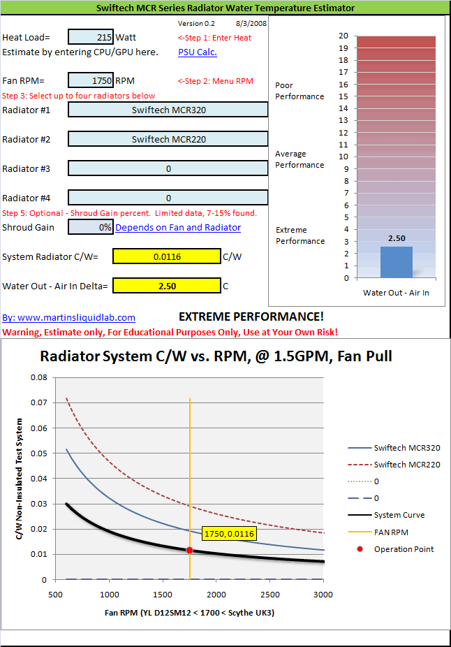 If the above charts are confusing, no worries, I've figured out a way to take that data and create another calculator for you. This estimator provides you a means to estimate your water delta based on your actual heat load, fan RPM, and even provides a shroud boost option. Furthermore it allows you to estimate the heat using more than one radiator and mixes of sizes that I've tested. So far, I have only included my tested MCR220 and MCR320 results.