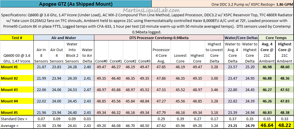 First up is my review of the block tested as shipped straight out of the box with nothing more than installation of the block as most users would make use of it. First I'm including the summary table of the raw data collected. Below you will see the averaged results of the 5 mounted tests run. Ambients were held to an average 21.98C with a .07C standard deviation. Water temperatures were kept to a very nice low 2.4C thanks to the awesome TFC480ER radiator, and flow rates as tested and powered by a DDC3.2 pump with XSPC reservoir top were at 1.86GPM. Overall this produced very nice low core temperatures for this overclocked quad core staying at a nice 48C maximum core temperature for a 21C ambient. What more can you ask for...