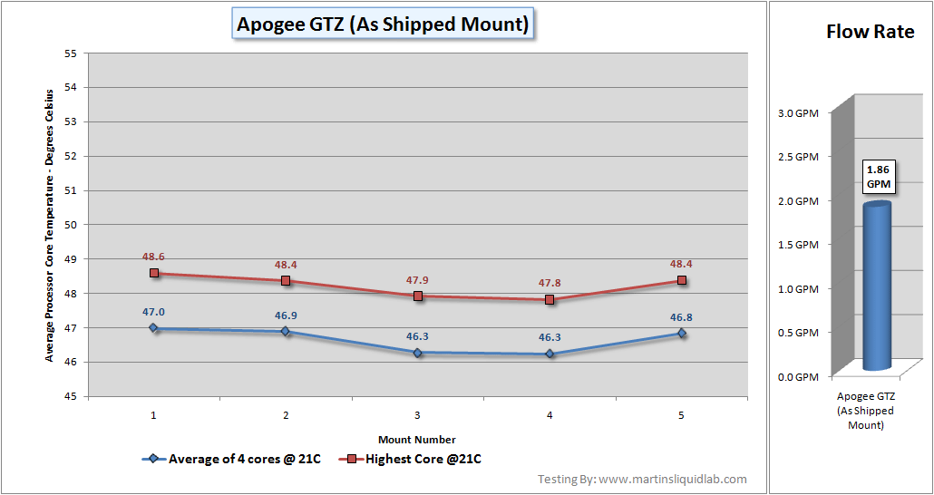 The results are good, the Fuzion V2 is probably more of an average restriction block and so is the GTZ, there are several other blocks with much higher restriction than this. In addition these flow rates are much higher than your typical >1GPM rule of thumb so the selected pump still has alot of reserve pumping power for additional blocks in this loop. I wouldn't hesitate to run the GTZ along with your other favorite GPU or chipset blocks. There have been some purposeful design tweaks in the nozzle present to minimize the amount of pressure drop of this block, and it's definately paying off here with the average restriction.