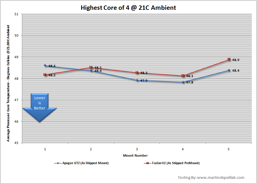 Since my last big testing included the D-Tek Fuzion V2 being one of the best performing blocks out there, I figured why not show a comparison to that. So I retested the Fuzion V2 stock with the as-shipped Fuzion Promount and backplate and came up with the following 5 mount comparison.