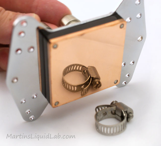 When you take the block apart, you'll find only a few typical parts. The cast black aceta/delrin top with the chrome plated steel hold down, an o-ring, and a CNC machined copper base with a very fine diamond pin matrix design. Also note the top has funnel shaped flow spreader notches in the top, this allows the water to spread out from the barb holes and flow more evenly across the base.