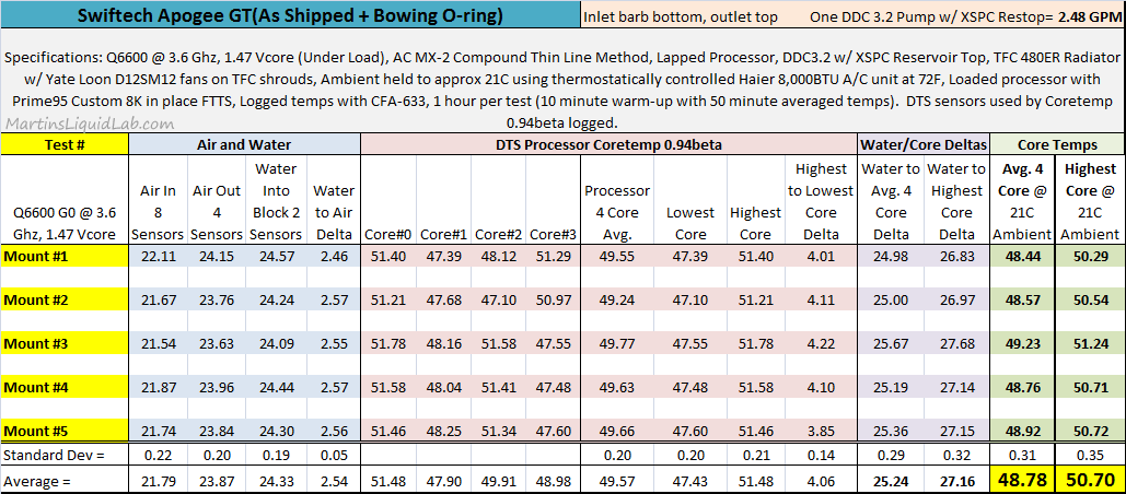 Overall testing conditions were held fairly constant thanks to my window A/C unit and logging the results. Ambient were held on average to 21.8C, water to core deltas were held to 2.5C thanks to the mighty TFC480 radiator, and the average high to low core delta was about 4 degree C.