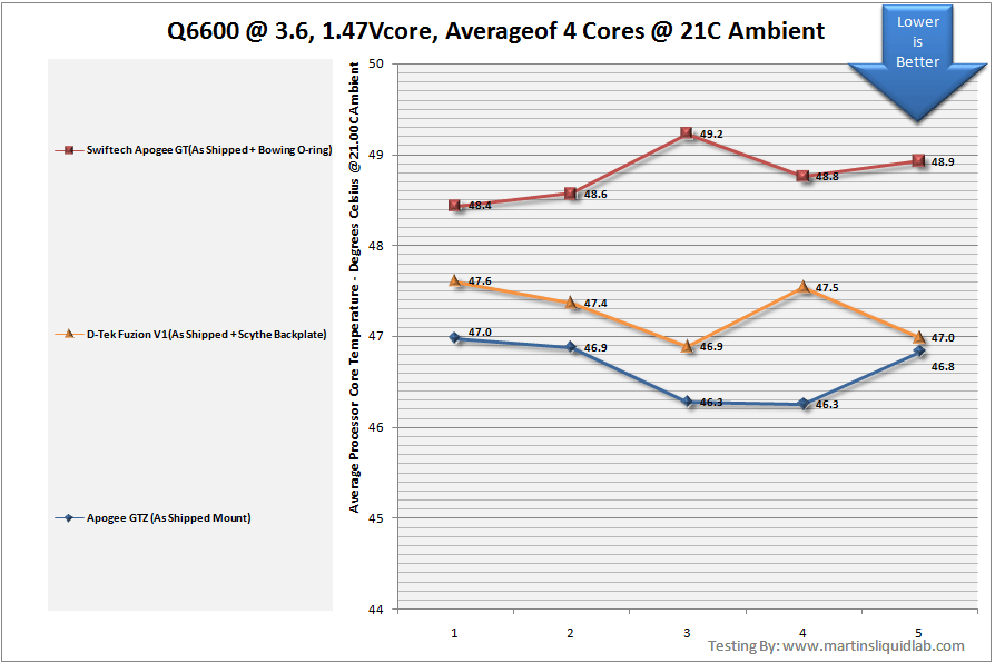 This chart shows the average temperature across all four cores. It's average about 2C higher average core temperatures than the flagship GTZ block. This is actually doing a fine job of keeping the Q6600 cool even at the over-clocked 3.6Ghz and 1.47 Vcore, it's not having any sort of problem running Prime 95 for 5 hours straight here.