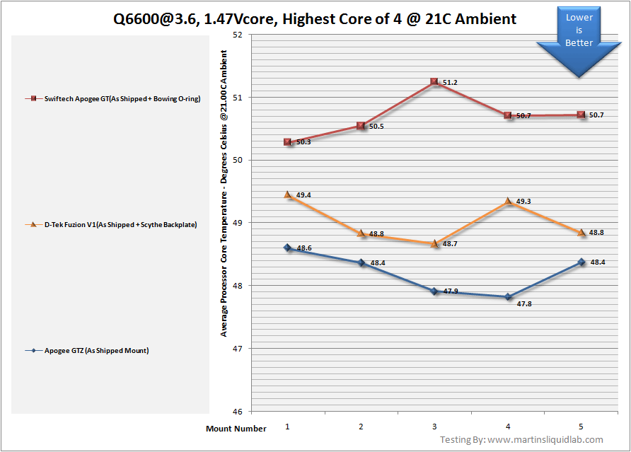 Mounting consistence produced results that were within about a .4C standard deviation, and the hottest core ran about 50.7C on average.