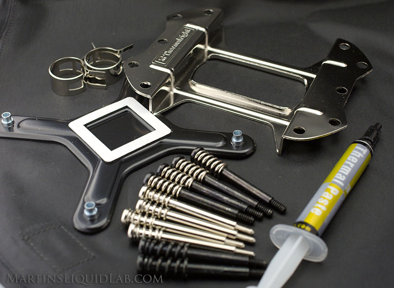 And look here, it comes with a back-plate!, barbs, hose-clamps, and the necessary screws. Unfortunately the back-plate is not a stud type, it is a front loading type that will require motherboard removal during maintenance removal. You could however modify the mounting screws by replacing them with studs, plastic nuts, and waters and still utilize this back-plate in a normal stud system that would allow future access without removal. It's also nice to see enough thermal grease for the next 10 years worth of applications, that's a lot of "thin line" applications.