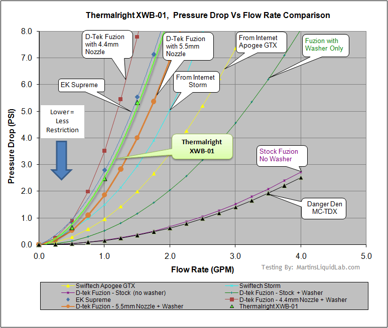 And to get a better sense of restriction comparison, here it is with several other curves. It follow very closely to that of the EK Supreme and somewhere between the 4.4 and 5.5mm nozzle with the fuzion.