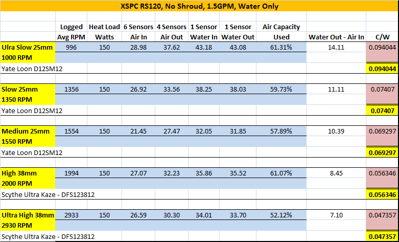 See Thermal Testing Specification on this page) on this radiator using my crystalfontz to log two air inlet, two air outlet, a water inlet, and a water outlet over 5 1-hour tests. Each test was run using a different fan and RPM setting to give you a nice broad range of performance figures. Flow rate was fixed at 1.5 GPM and heat load was provided by a modified aquarium water heater plus an assumed 15 watts for the DDC2 pump for a total of 150 watts which was kept within a couple of watts using a variac. Each fan was tested the same using a pull configuration without shroud. I also decided because this is a single radiator, one 150 watt heat load would be sufficient.
