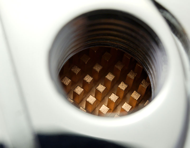 The block is a finely CNC machined block. The base is a circular solid copper base with very very fine diagonally cut square micro-pins. There is a large number of pins. I was pleasantly surprised to see the pins up close, they are very well machined for such fine and difficult thin cuts, all of this will result in a very large heat transfer surface area which is good. The top is a machined brass all metal top with a chrome finish. I really like the unique look it gives and the all metal construction ensure long term durability. This chipset block would also go extremely well with the X2O CPU block as they have very similar features and looks.